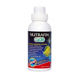 Nutrafin Cycle – Biological Aquarium Supplement features a high-concentration formula that immediately establishes a safe biological aquarium environment. Cycle goes to work fast, releasing massive amounts of beneficial bacteria that eliminate toxic ammonia and nitrites and creating a biologically well-balanced aquarium for healthy fish to thrive. It is also ideal for quickly establishing safe and essential conditions in new aquarium setups, so that you can introduce fish to new aquariums immediately. Regular application helps to competitively exclude the establishment of undesirable bacteria in aquariums. Cycle provides consistent results thanks to our unique and proprietary bio-floc technology that preserves product stability, efficacy and shelf life. High-quality production processes ensure that every container of Cycle contains pure, safe bacterial colonies free of undesirable contaminants. Cycle is an all-natural product that will not harm plants, animals or humans. It does not require refrigeration. For fresh and saltwater use. Size: 250 mL (8.4 fl oz) DOSAGE: New Aquariums Day 1: 25 mL per 38 L (10 U.S. gal) Day 2: 10 mL per 38 L (10 U.S. gal) Day 3: 10 mL per 38 L (10 U.S. gal) All regular maintenance activities (water changes, filter maintenance, etc.) 5 mL per 38 L (10 U.S. gal) After adding new fish and/or medicating 10 mL per 38 L (10 U.S. gal) Weekly dosage to maintain a strong beneficial biological colony 5 mL per 38 L (10 U.S. gal) Other sizes available: -A7595 Nutrafin Cycle – Biological Aquarium Supplement, 30 mL (1 fl oz) -A7900 Nutrafin Cycle – Biological Aquarium Supplement, 120 mL (4 fl oz) -A7904 Nutrafin Cycle – Biological